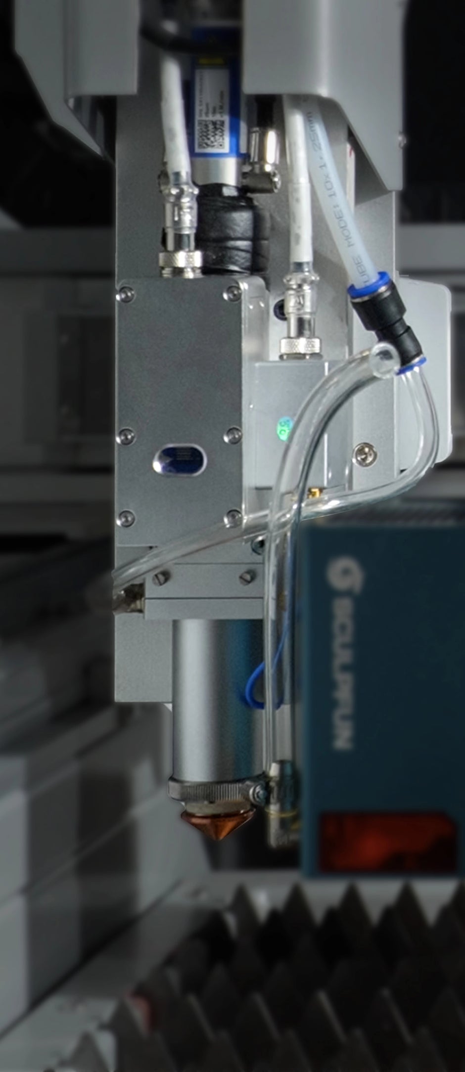 Both the laser source and the cutting head are air-cooled. The cutting head is a custom, compact, auto-focus air-cooled head designed for minimal footprint and simplified installation — no external chilled-water loop required.